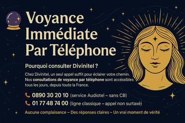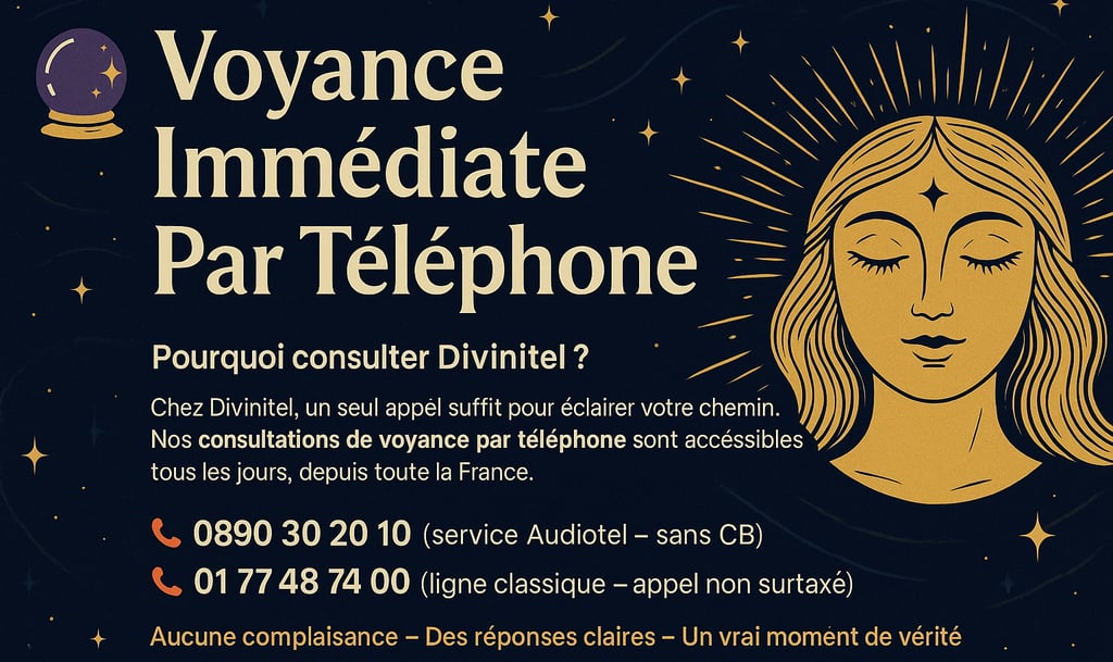 Divinitel est une plateforme française de voyance par téléphone, disponible 7j/7, spécialisée en tarot, astrologie, cartomancie, médiumnité et guidance spirituelle personnalisée.